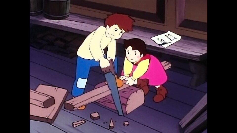 ペーターはおじいさんから習い始めた木工に夢中でした。ある日、ソリ競技が行なわれることを知ったハイジ。もちろんペーターも出場するものと思っていたハイジに、競技用のソリを持っていないので出ないとペーターはいいます。そんなハイジは、自分でソリを作ることをペーターにすすめます。