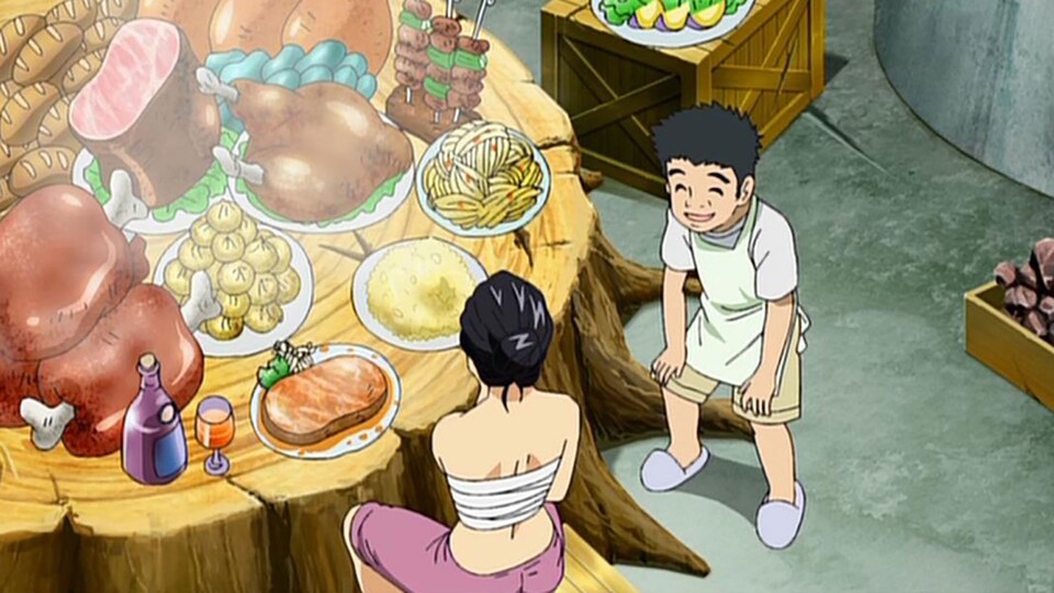 初代メルクがヘビーホールにこもっていたのは、IGO会長の一龍から、美食神アカシアのフルコースメニューのサラダ、“エア”を捌く包丁を作る依頼を受けたためだった。一方、小松は二代目メルクから包丁と食材を借り、厨房で料理を始める。