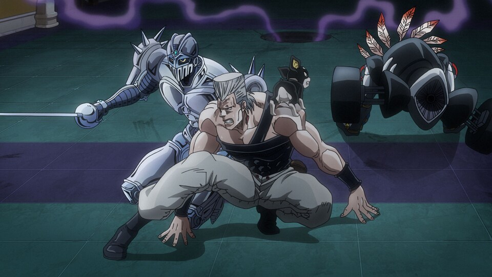 長く険しい旅を共にしてきた仲間との、突然の別れ――。あまりにもあっけなさすぎる事態に、感情を抑えきれないポルナレフ。怒りを爆発させて剣を振り回したことで、姿の見えない敵に傷を負わせたものの深手にはならず。だが、突然空間から姿を現して襲いかかってくる謎の敵スタンドの攻撃はとどまることがない。体勢を整えるため、その場を移動したポルナレフとイギーは、広間で背中合わせになって見えない敵の襲撃に備えるが!?