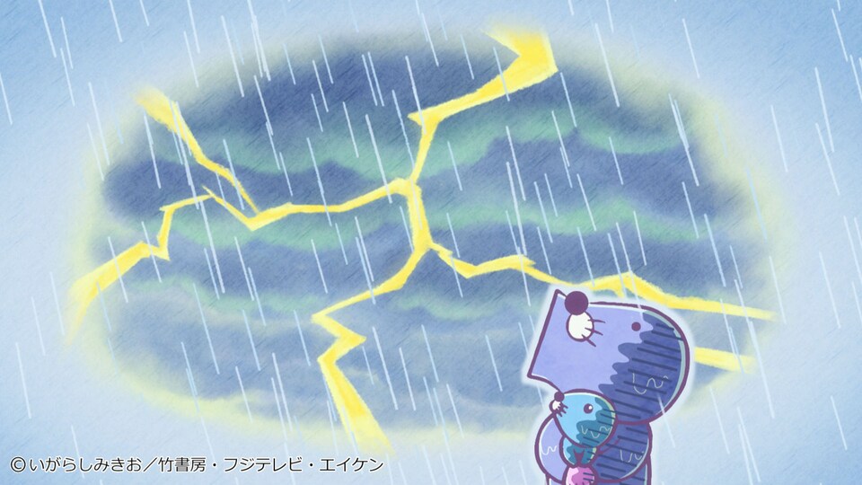これは赤ん坊の頃のボクと、おとうさんのおはなし――。立つ練習をしているぼのちゃんとぼのちゃんのおとうさん。風を感じて海の方を見ると、大きな黒い雲が迫ってきていた。嵐が来ると教えるが、ぼのちゃんは喜ぶばかり。雷を見ても喜ぶぼのちゃんに、ぼのちゃんのおとうさんが雷の怖さを身振り手振りで教えていると…。