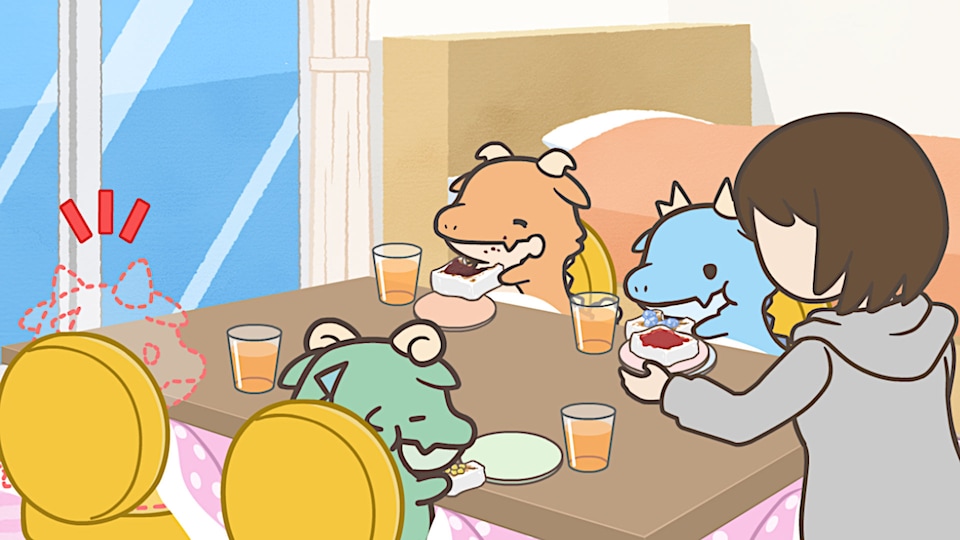 ぬしがおもちを焼いてくれたのに、めらの姿がありません。その日の朝、ぬしがめらを叱ったので、家出をしてしまったようなのですが――。