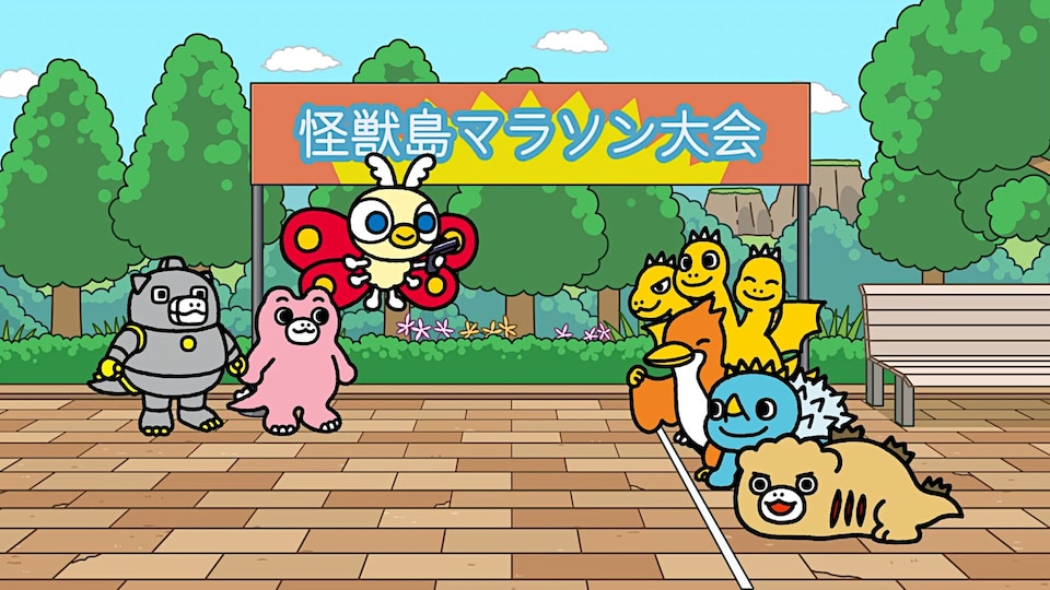 走りきったぞー!と倒れこんでいるちびゴジラ。ちびメカゴジラがどうしたのか聞いてみると4年ぶりに開催される「怪獣島マラソン大会」に向けて練習しているようで…